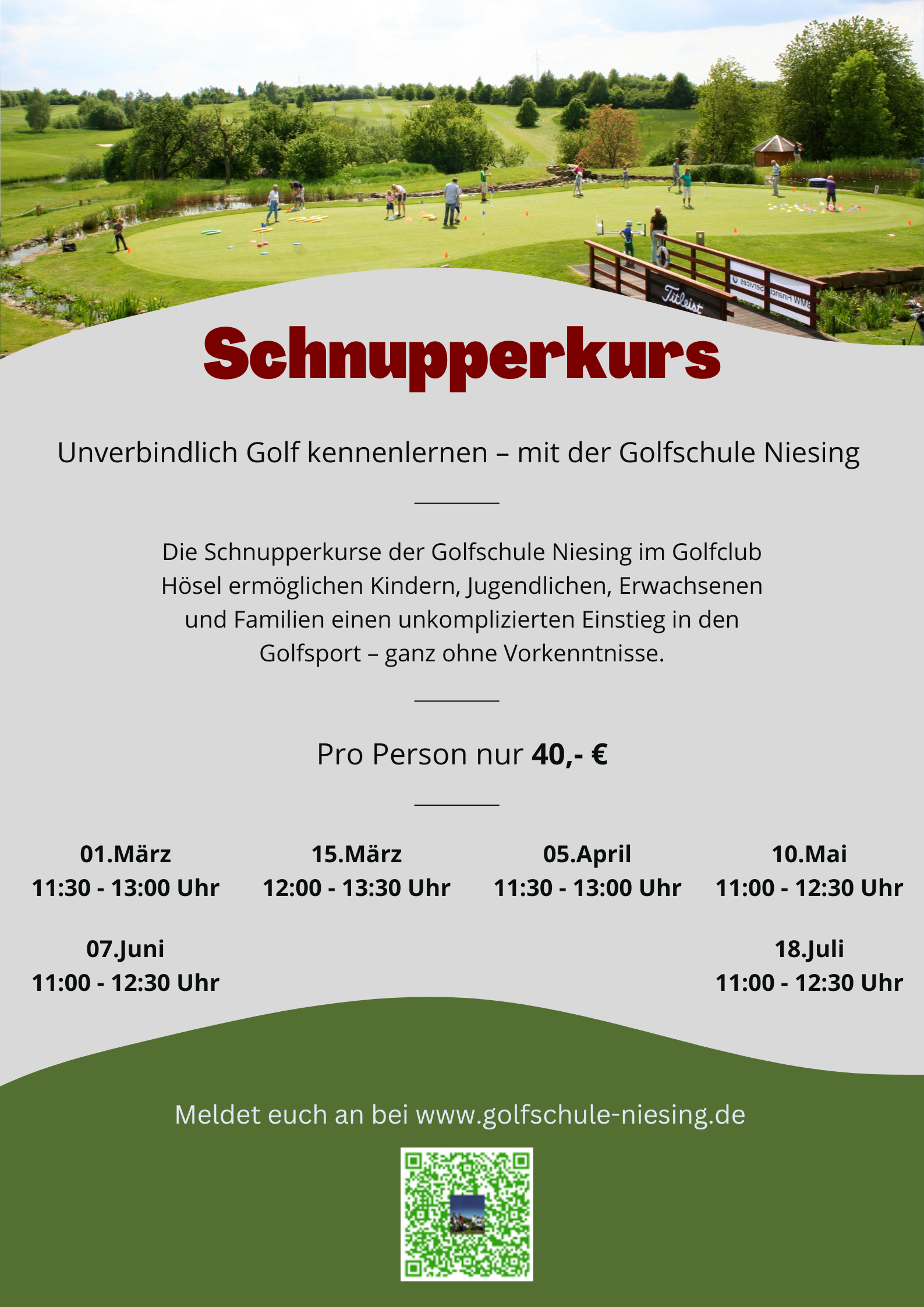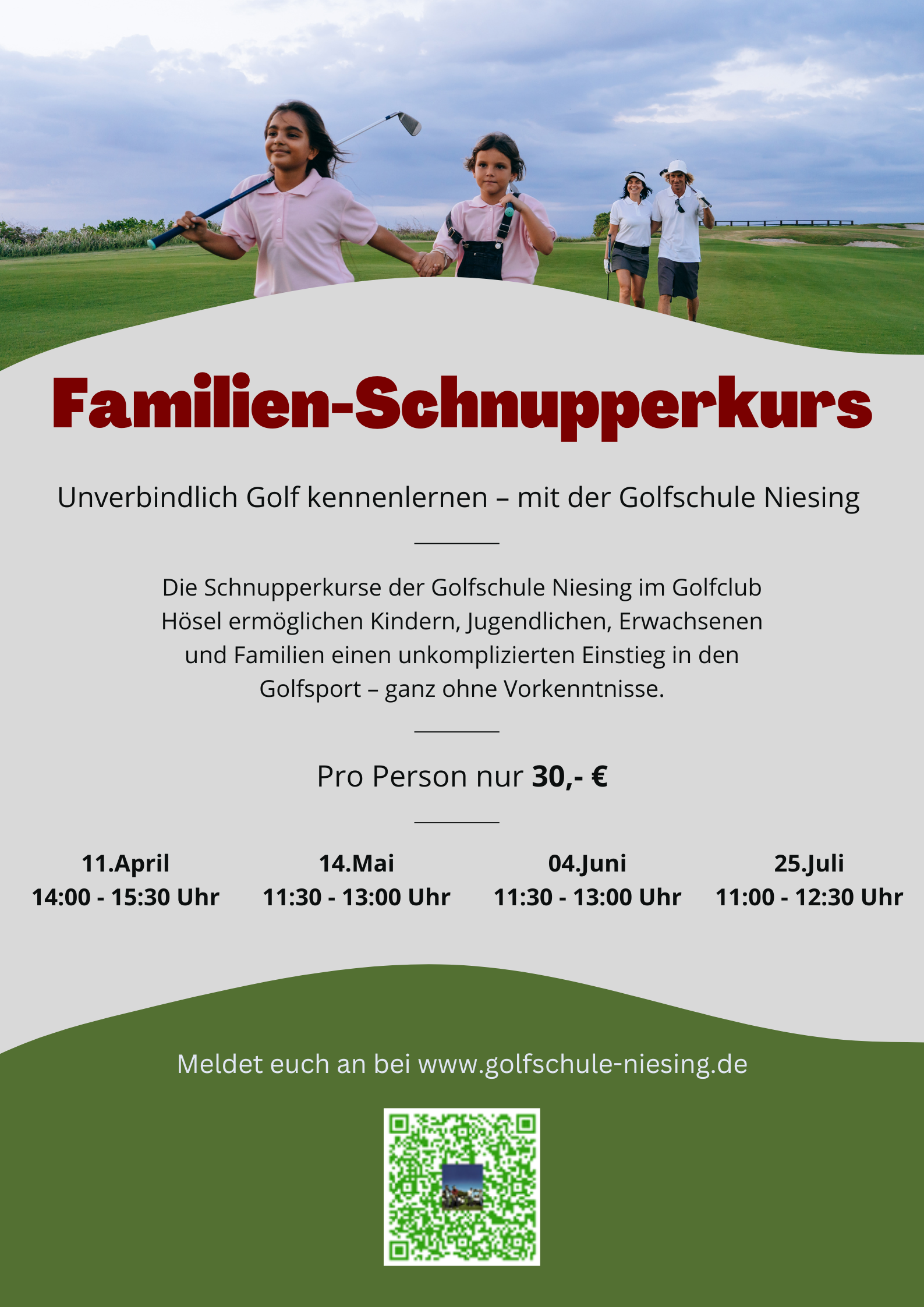 Die Familienschnupperkurse der Golfschule Niesing im Golfclub Hösel bieten Eltern und Kindern die Möglichkeit, den Golfsport gemeinsam kennenzulernen. Der Unterricht ist altersgerecht aufgebaut und verbindet spielerische Elemente mit ersten technischen Grundlagen.